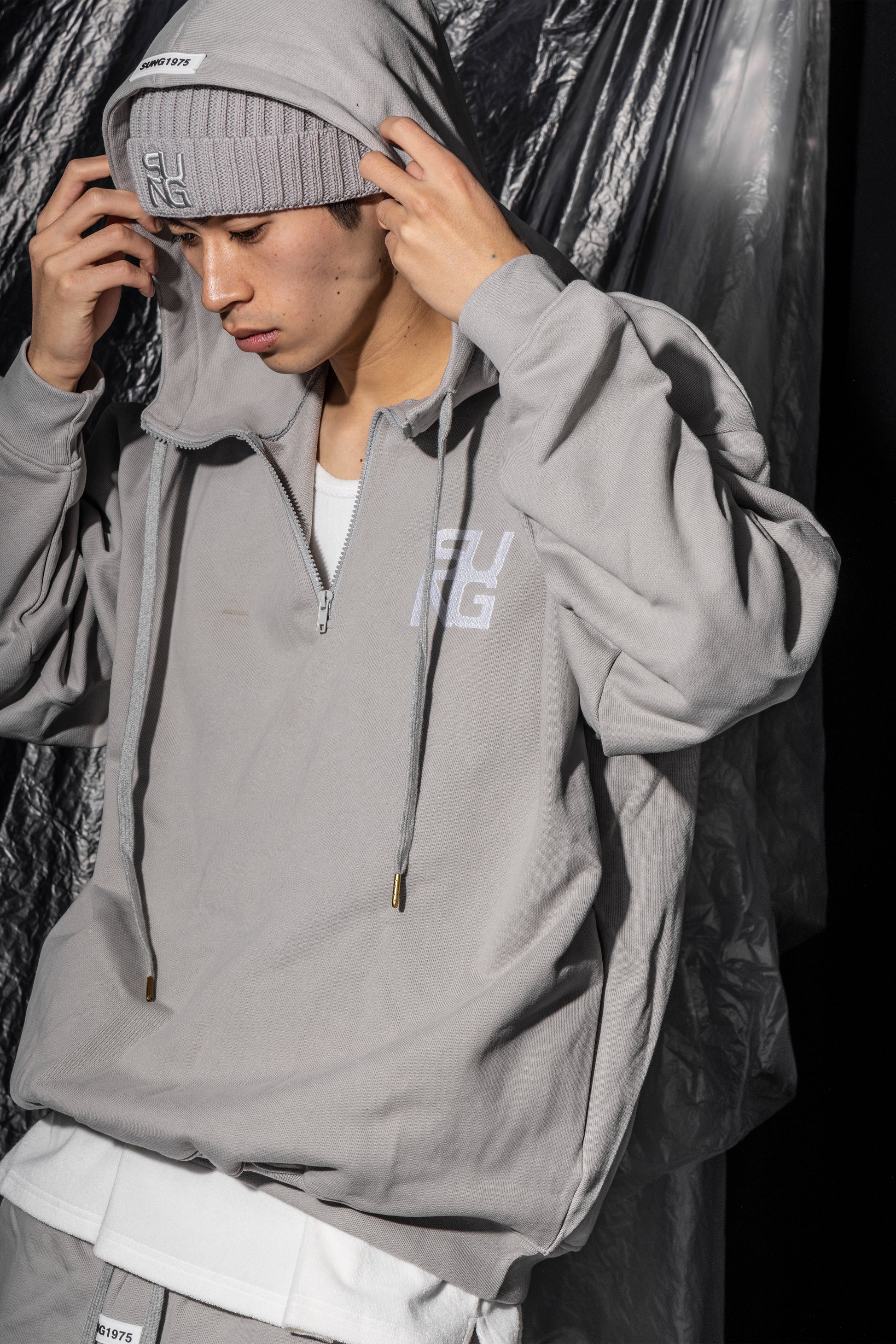 後ろ見頃にSUNG1975の大きなラバーネームを付けたハーフジップフーディ