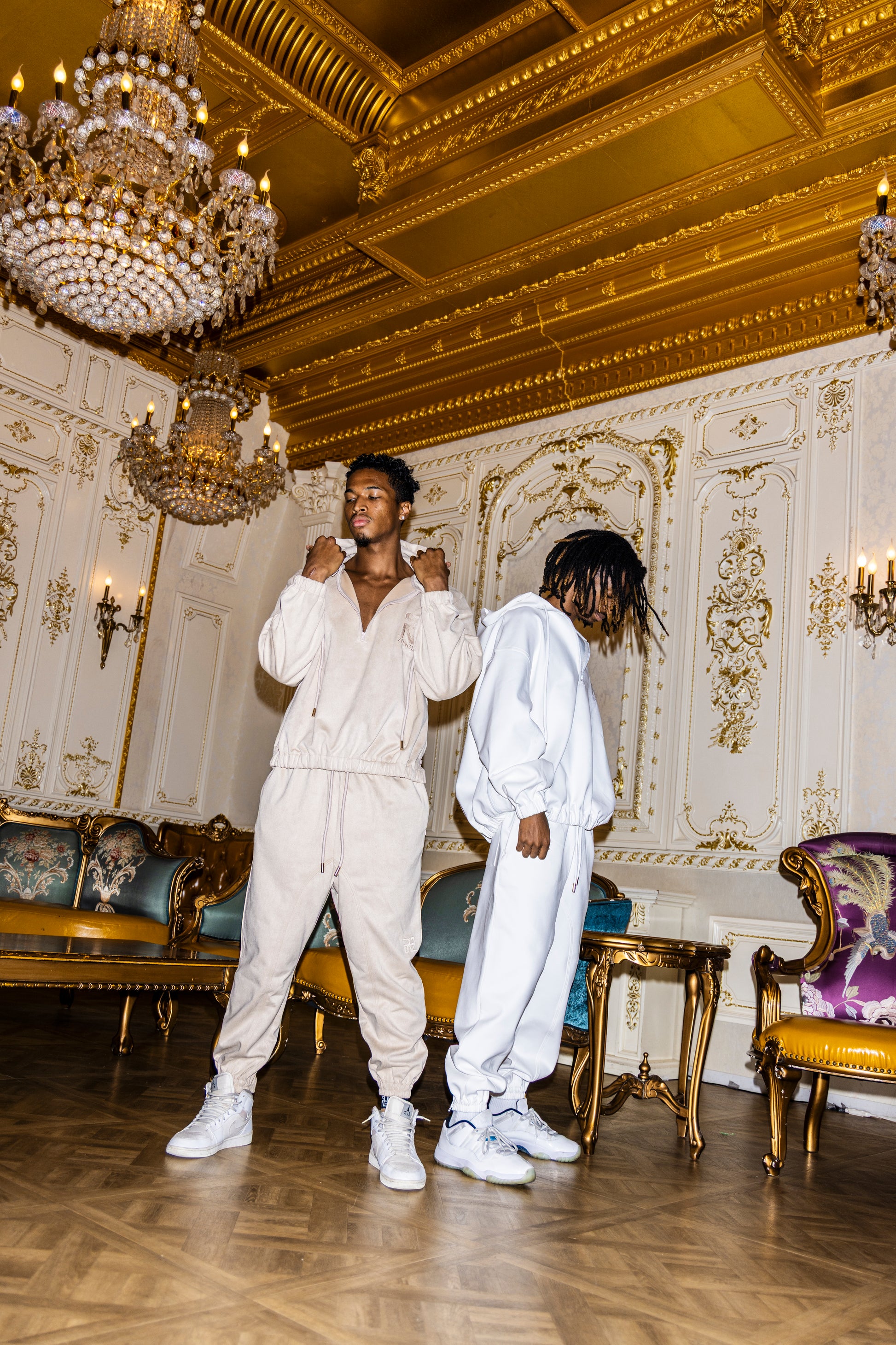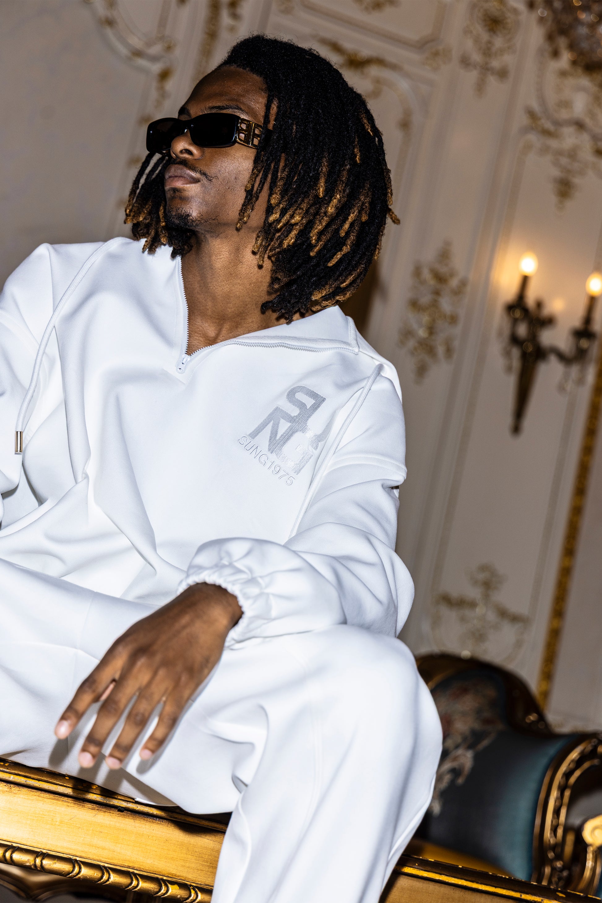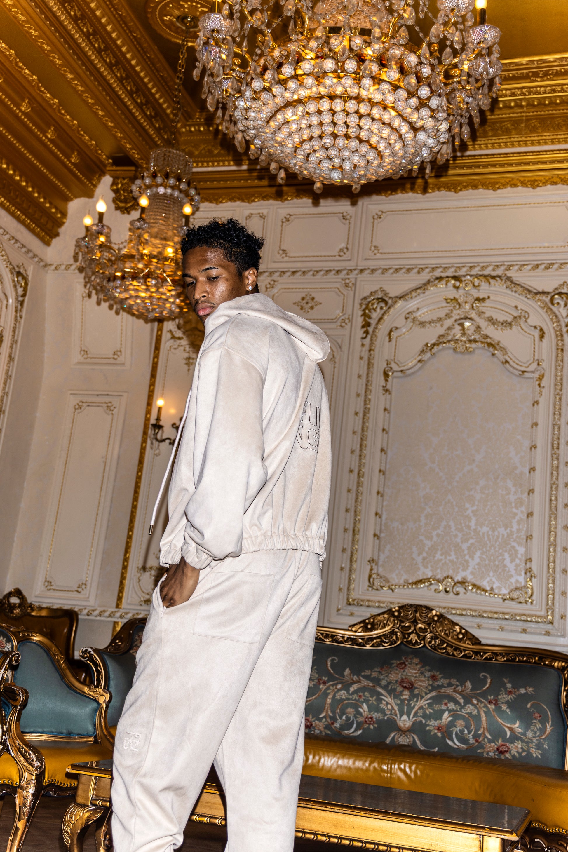 表面にほんのり起毛感のあるフェイクスエード調の素材を使用し、上品なムードを纏ったハーフジップフーディ。