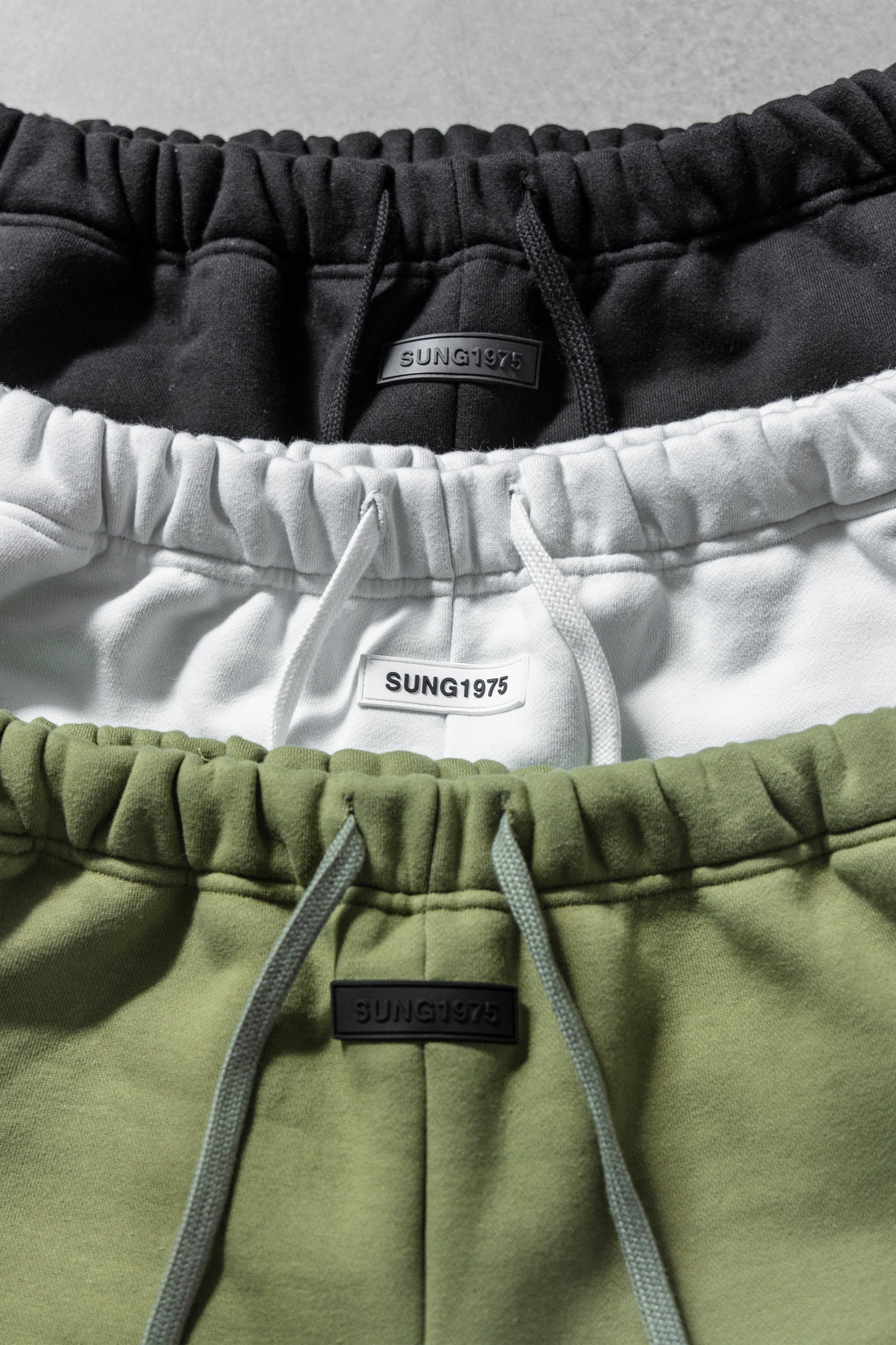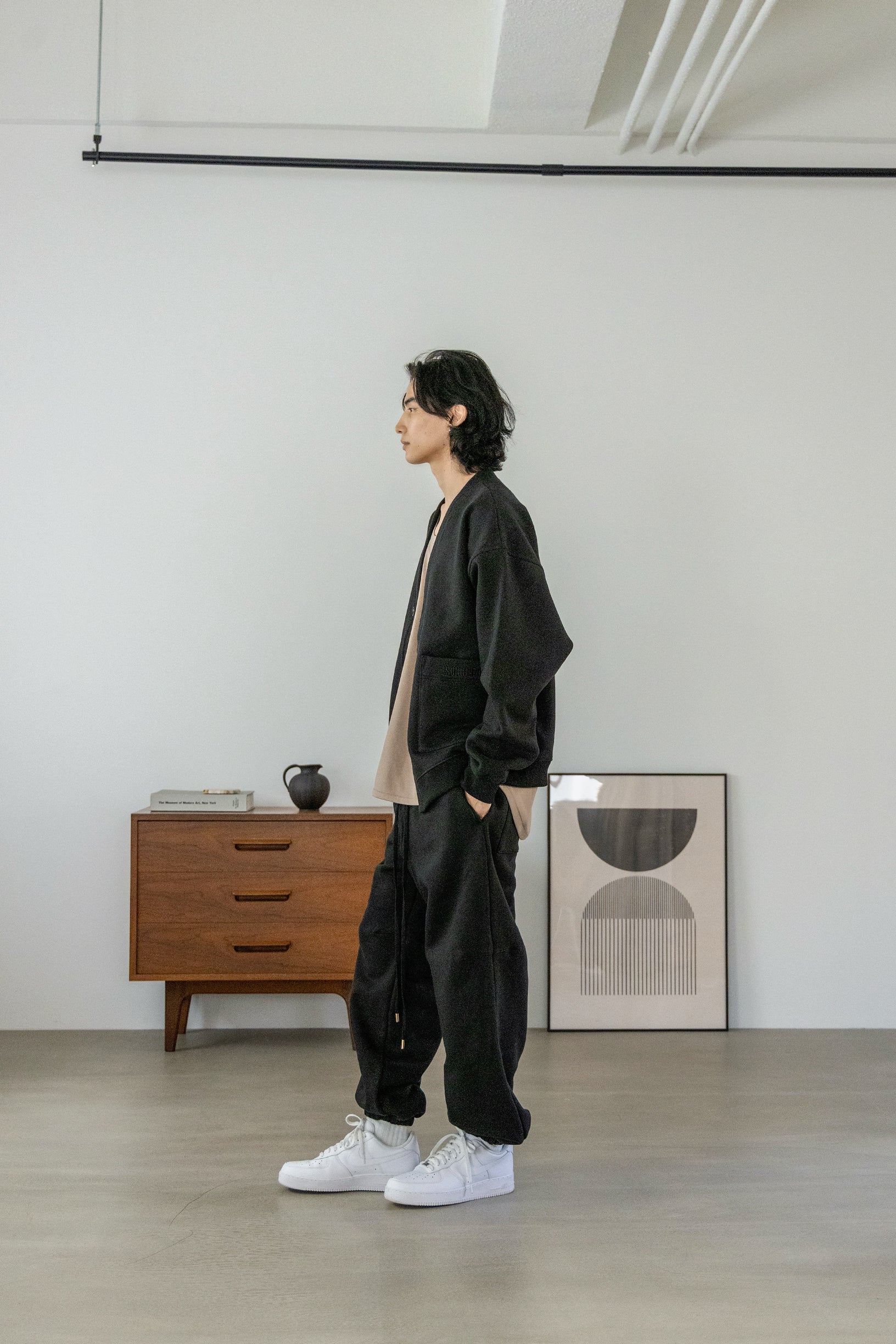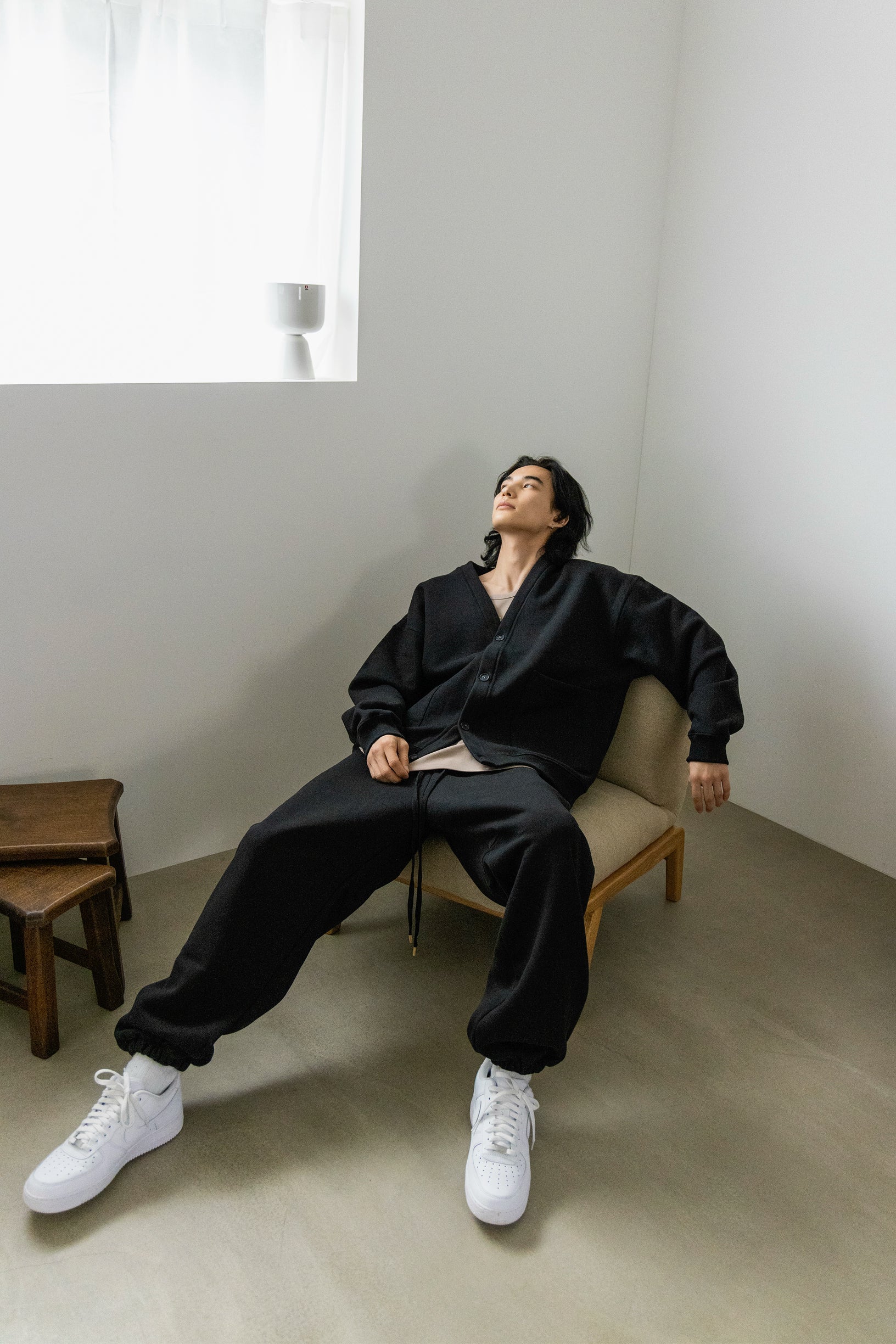 BRUSHED SWEAT CARDIGANと同素材を使用した、細部のディテールが光るスウェットパンツ。